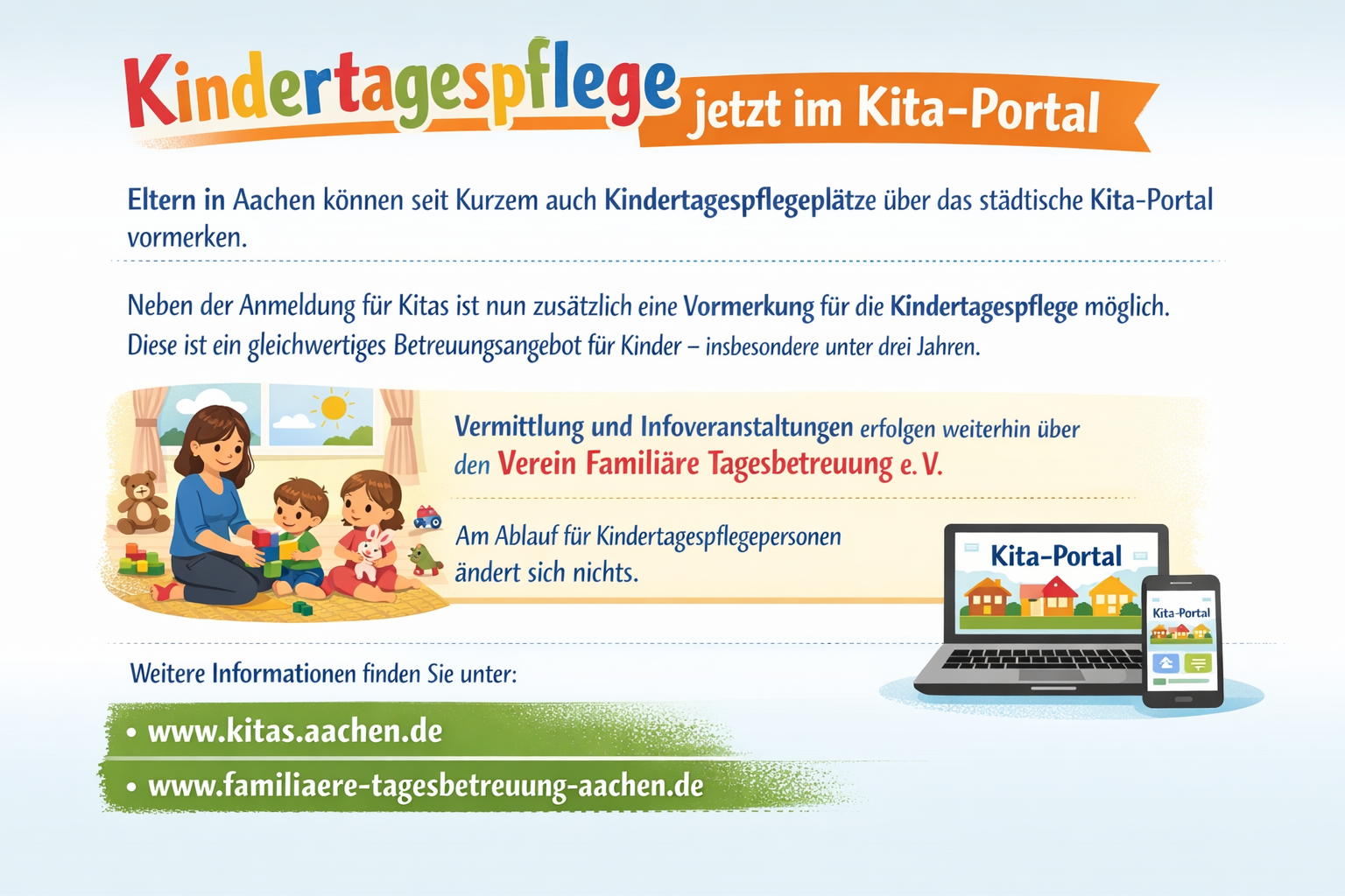 In Aachen ist der Verein Familiäre Tagesbetreuung als Fachvermittlungs- und Fachberatungsstelle, wie auch als Bildungsträger für die Tageskinder, die Eltern und die Kindertagespflegepersonen zuständig.